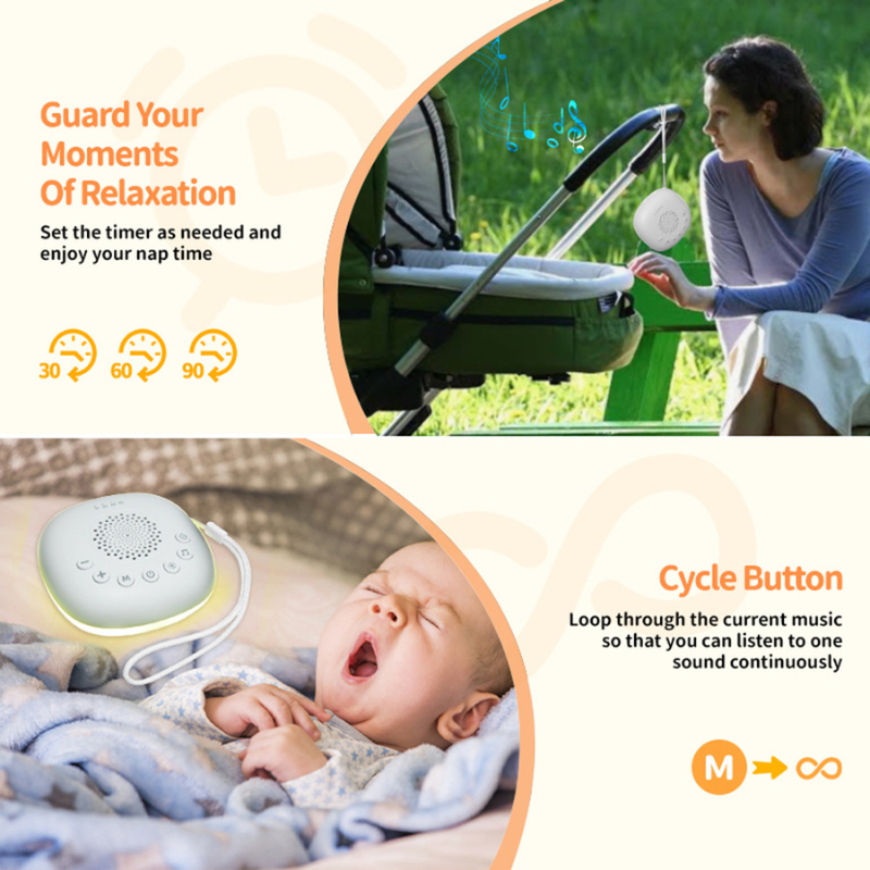 Maskinen har inbyggt nattljus med färgskiftning, som skapar en avslappnande atmosfär i sovrummet. Den kompakta storleken gör den enkel att ta med på resan, så att du alltid kan skapa en trygg miljö både hemma och borta.