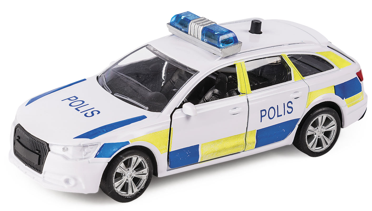 Polisbil i metall med ljus och ljud Svensk polisbil med ljud och ljus när du trycker på knappen. Polisbilen mäter ca 13 cm och kan öppna framdörrarna. Polisbilen har en pullback.