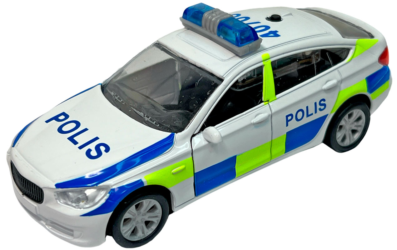 Polisbil i metall med ljus och ljud Svensk polisbil med ljud och ljus när du trycker på knappen. Polisbilen mäter ca 13 cm och kan öppna framdörrarna. Polisbilen har en pullback.